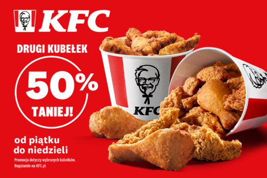 Drugi Kubełek 50% Taniej powrócił! 🍗 Teraz od piątku do niedzieli w KFC drugi kubełek 50% taniej! Nie przegap wpadaj do KFC! Promocja dotyczy wybranych Kubełków. Regulamin na KFC.PL