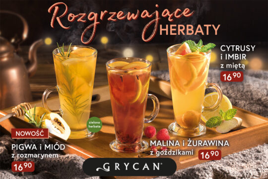 Jesień to idealna pora na herbaty w lodziarnio-kawiarniach Grycan! Przedstawiamy nasze rozgrzewające połączenia, pełne owoców i korzennych przypraw: Nowość – Pigwa i miód z rozmarynem na bazie zielonej herbaty, Bestseller – Malina i żurawina z goździkami oraz Cytrusy i imbir z miętą. Serdecznie zapraszamy!