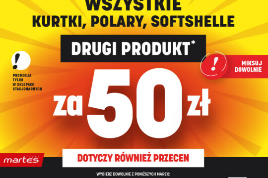 W dniach od 7 do 31 października przyjdź do sklepu stacjonarnego Martes Sport i kup kurtkę, polar lub softshell, a drugi produkt otrzymasz za jedyne 50 zł! Mieszaj i łącz produkty wybranych marek, aby stworzyć idealny zestaw na każdą pogodę. Szczegóły i regulamin dostępne na stronie: sklepmartes.pl/regulaminy. Oferta obowiązuje wyłącznie w sklepach stacjonarnych Martes Sport.